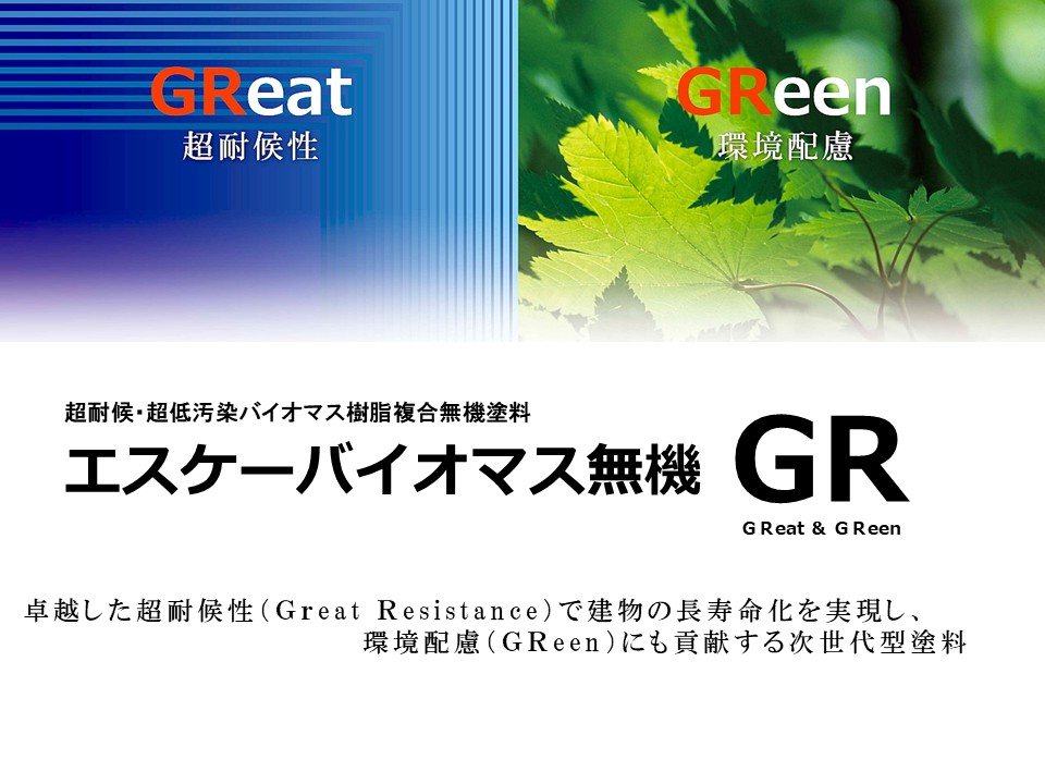 今回ご紹介する製品は、「超耐候・超低汚染 バイオマス樹脂複合無機塗料 エスケーバイオマス無機GR」です。