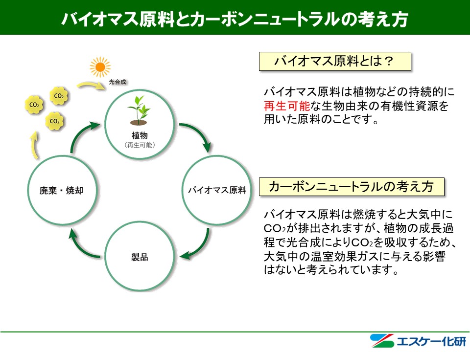 バイオマス原料とは、植物などの生物由来の有機性資源を用いた原料のことです。バイオマス原料は燃焼するとCO2 が排出されますが、植物の成長過程で光合成により、CO2を吸収するため、大気中の温室効果ガスに与える影響はないと考えられております。