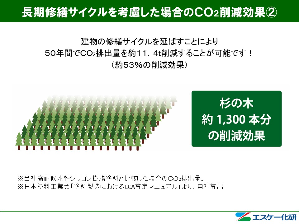 これにより、長期修繕サイクルを考慮した場合のCO2削減効果を従来の高耐候水性シリコン樹脂塗料と比較し、塗料のトータル的な使用缶数を削減し、大幅にCO2を削減することが可能です。