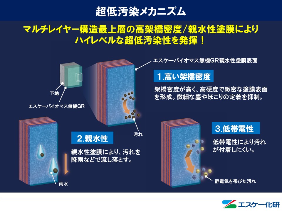 本製品はマルチレイヤー構造の最上層の高架橋密度の親水性塗膜表面により優れた超低汚染性を発揮します。